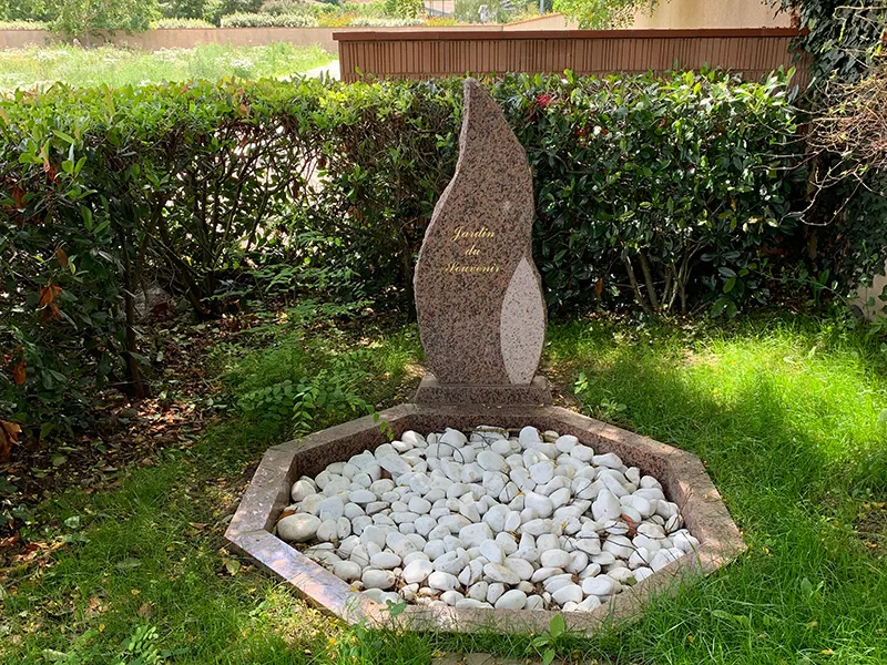 • Jardin du souvenir avec espace de dispersion, stèle en marbre, pas japonais et engazonnement